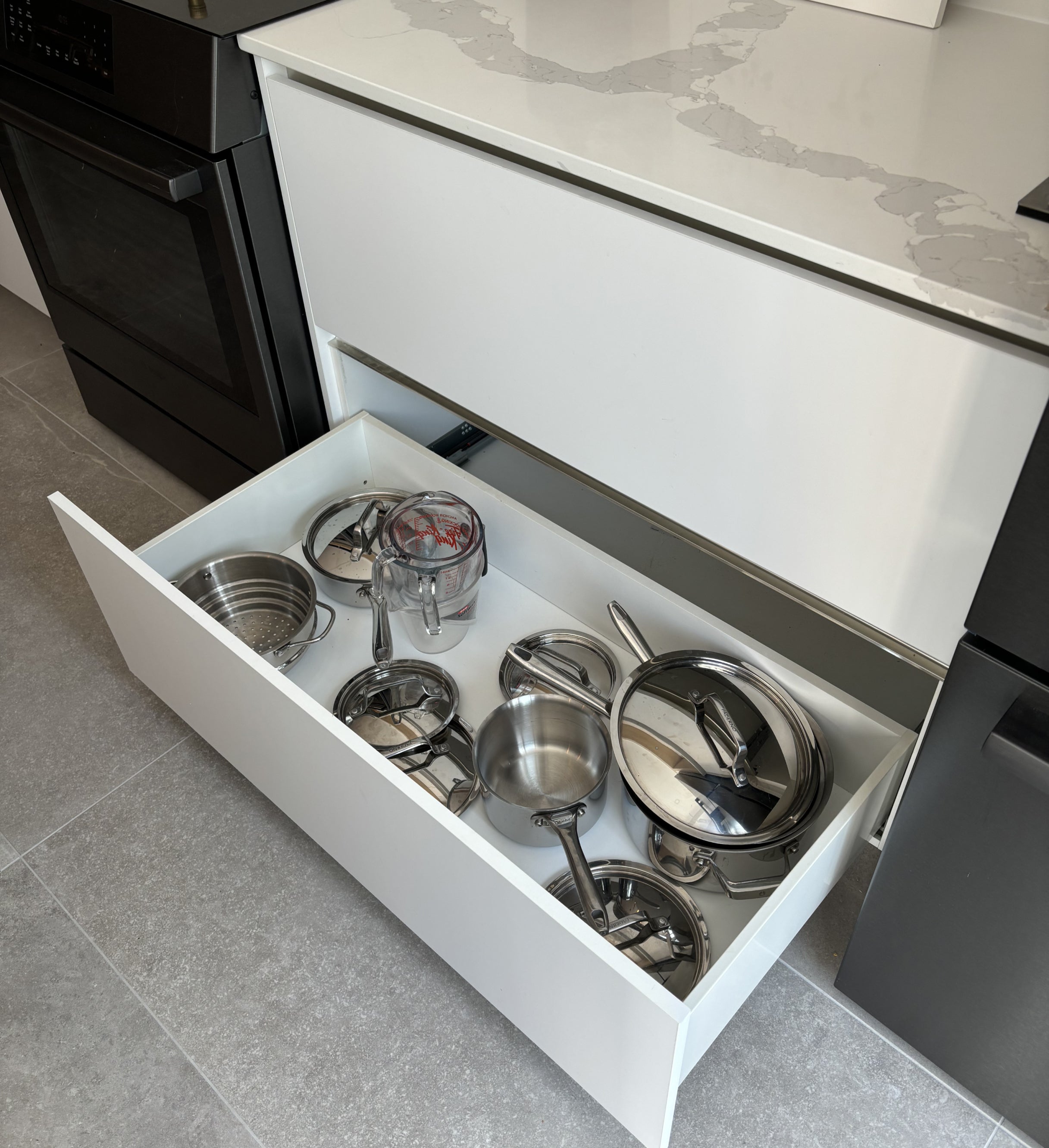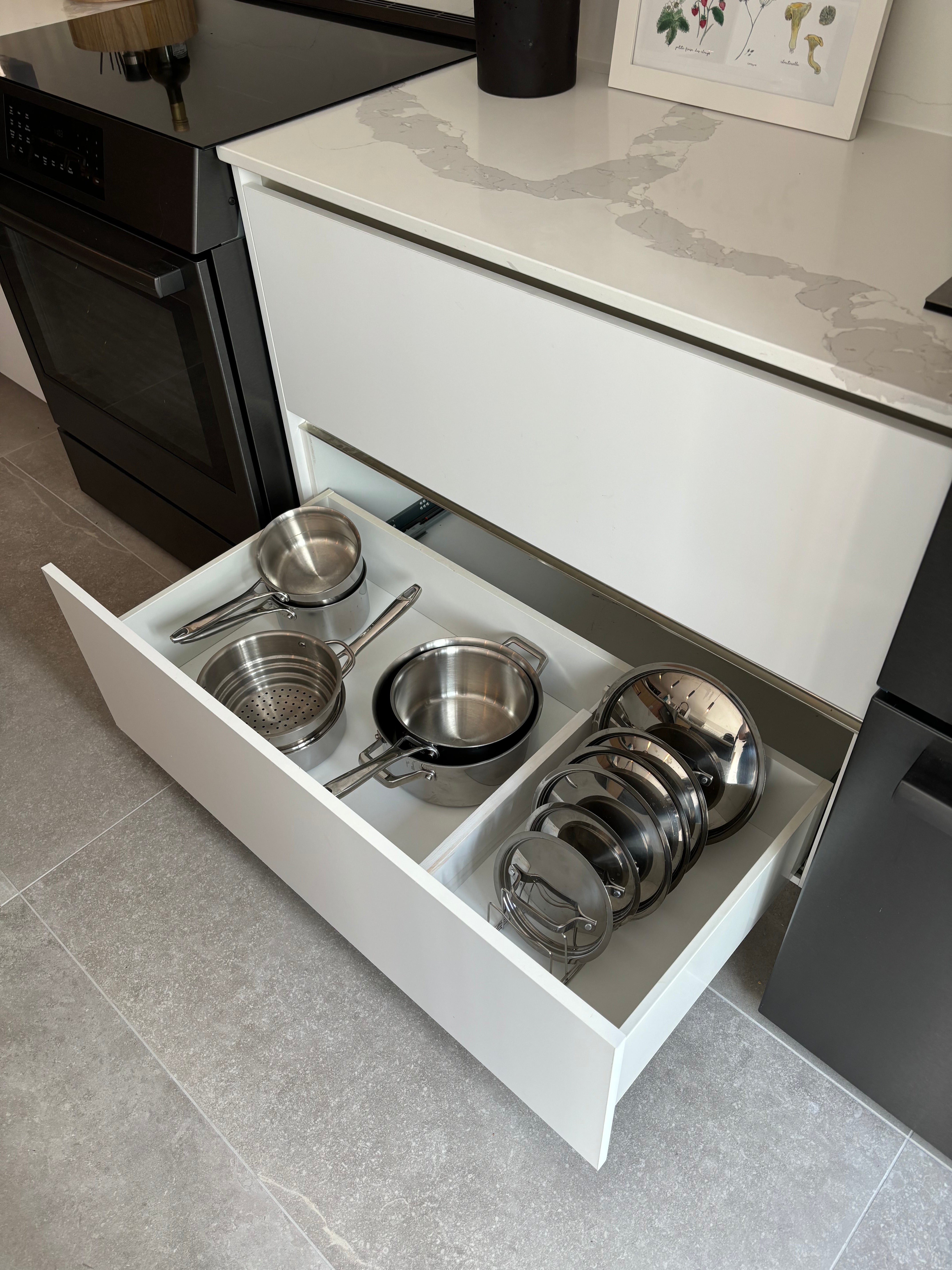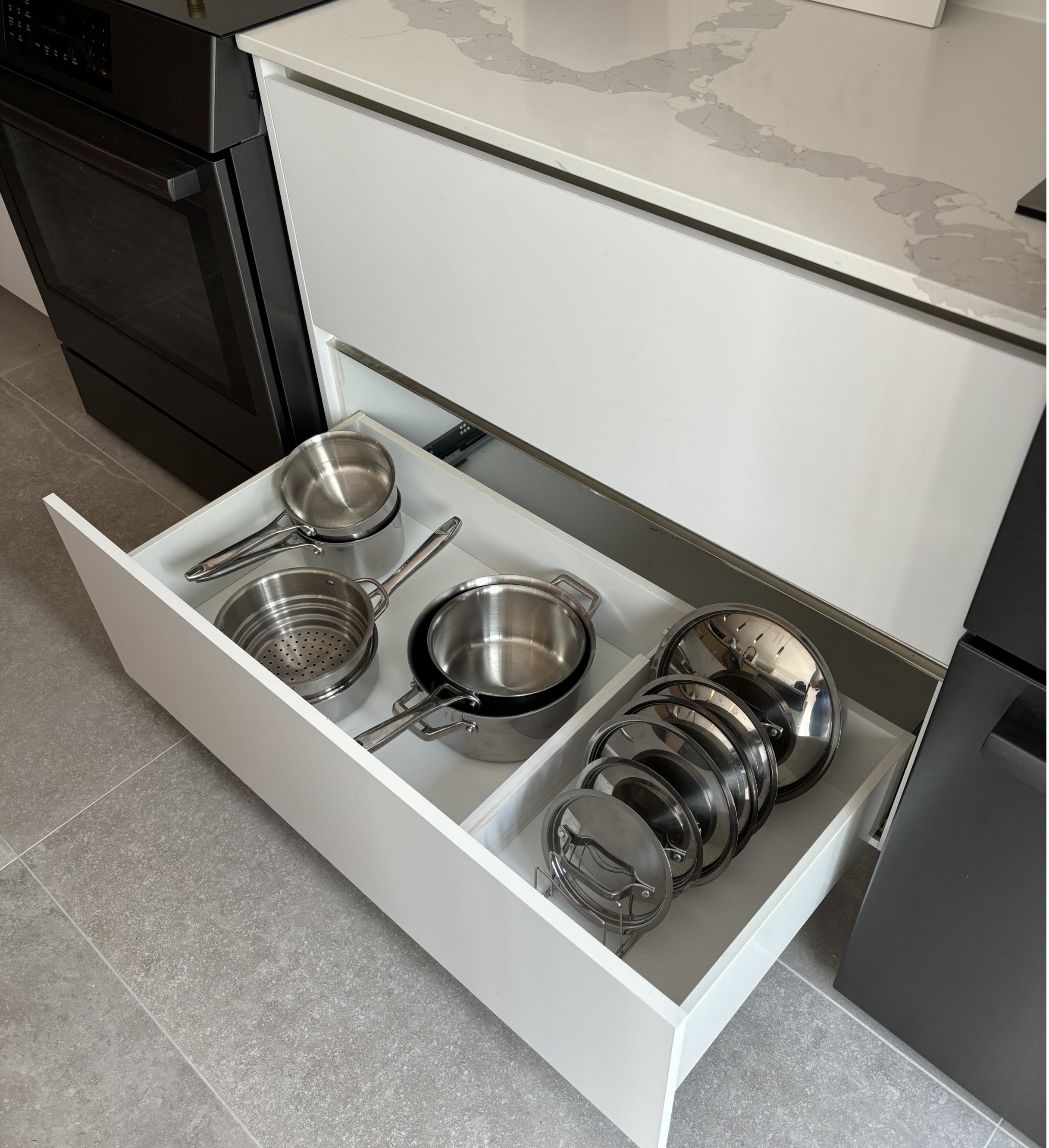 Notre client souhaitait que l’intérieur de ses armoires soit aussi soigné que l’extérieur de sa cuisine moderne. Nous avons trié et organisé chaque espace en fonction de son utilisation, en intégrant des solutions de rangement pratiques et esthétiques. Le résultat : une cuisine harmonieuse, ordonnée et cohérente, où l’intérieur des armoires reflète parfaitement le style épuré de la pièce.